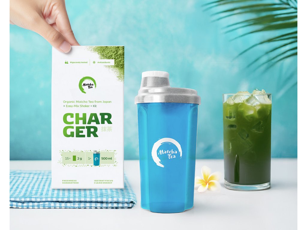 Charger S500 je kompletní starter pack — praktický modrý šejkr s objemem 500 ml a 15 porcí bio matcha Harmony v jedné krabici. Stačí otevřít, vysypat sáček, zalít vodou a protřepat. Ideální jako první krok do světa matcha, dárek nebo cestovní výbava.
